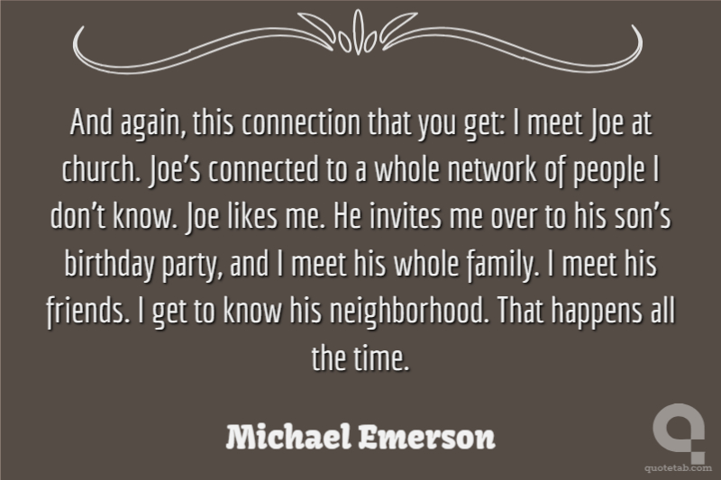 And again, this connection that you get: I meet Joe at church. Joe's connected to a whole network of people I don't know. Joe likes me. He invites me over to his son's birthday party, and I meet his whole family. I meet his friends. I get to know his neighborhood. That happens all the time.