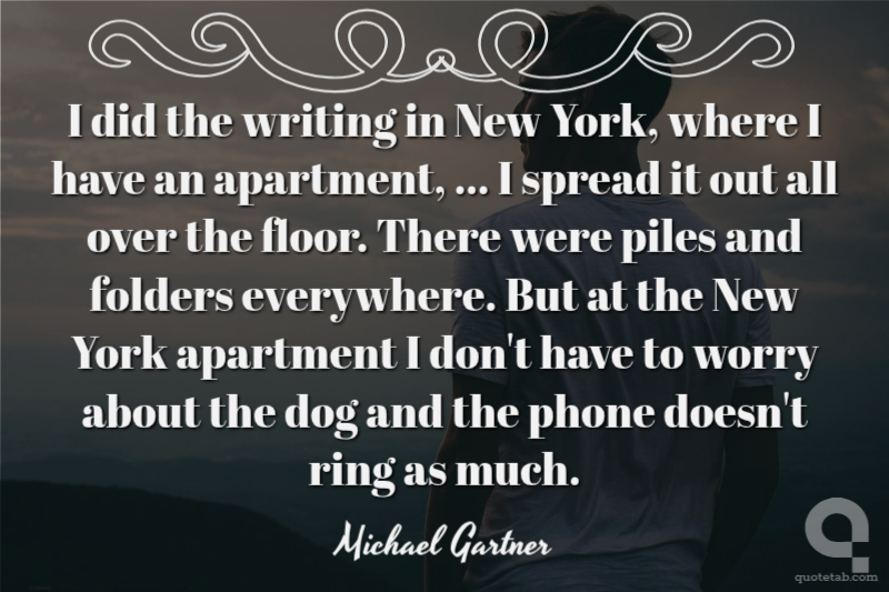 I did the writing in New York, where I have an apartment, ... I spread it out all over the floor. There were piles and folders everywhere. But at the New York apartment I don't have to worry about the dog and the phone doesn't ring as much.