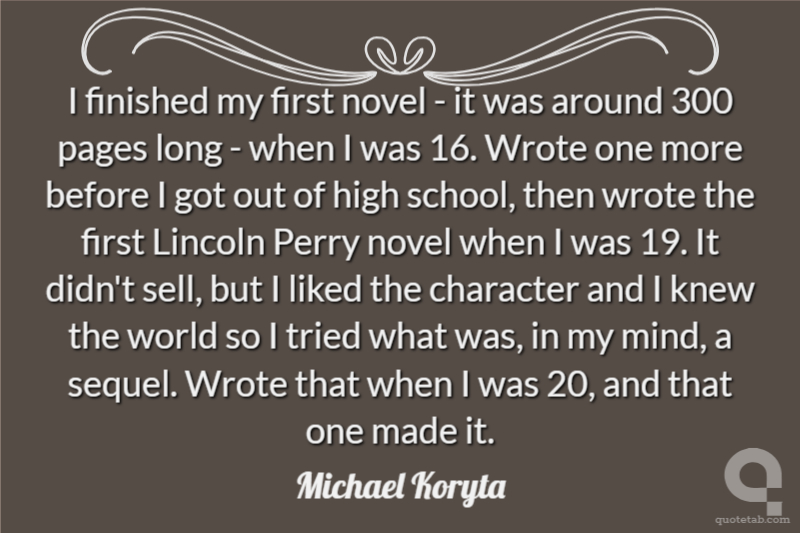 I finished my first novel - it was around 300 pages long - when I was 16. Wrote one more before I got out of high school, then wrote the first Lincoln Perry novel when I was 19. It didn't sell, but I liked the character and I knew the world so I tried what was, in my mind, a sequel. Wrote that when I was 20, and that one made it.