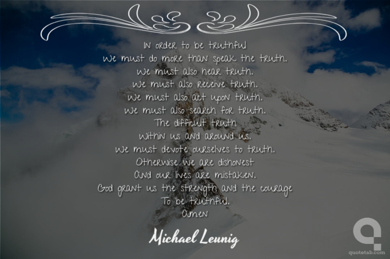 In order to be truthful We must do more than speak the truth. We must also hear truth. We must also receive truth. We must also act upon truth. We must also search for truth. The difficult truth Within us and around us. We must devote ourselves to truth. Otherwise we are dishonest And our lives are mistaken. God grant us the strength and the courage To be truthful. Amen