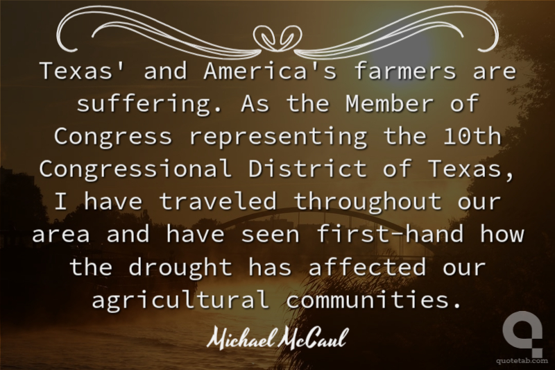 Texas' and America's farmers are suffering. As the Member of Congress representing the 10th Congressional District of Texas, I have traveled throughout our area and have seen first-hand how the drought has affected our agricultural communities.