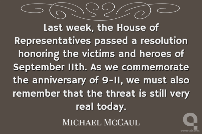 Last week, the House of Representatives passed a resolution honoring the victims and heroes of September 11th. As we commemorate the anniversary of 9-11, we must also remember that the threat is still very real today.