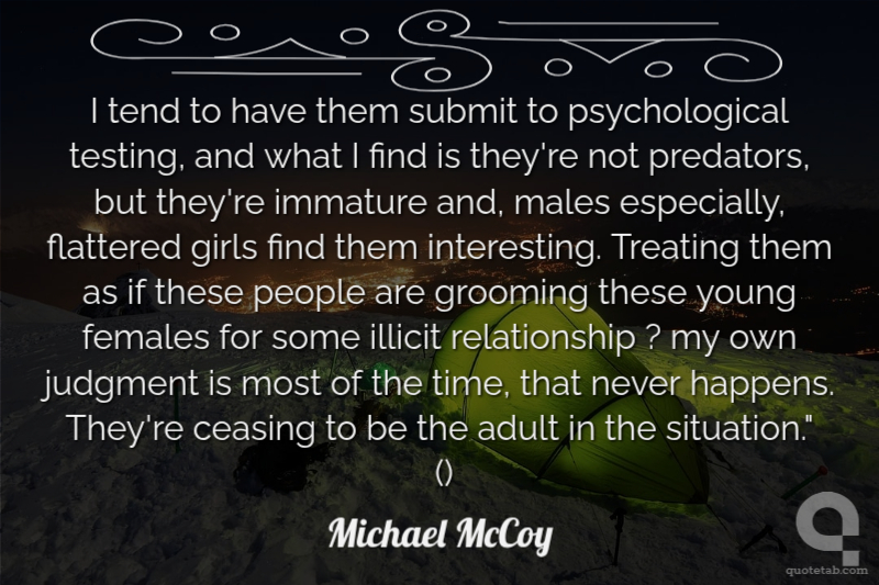 I tend to have them submit to psychological testing, and what I find is they're not predators, but they're immature and, males especially, flattered girls find them interesting. Treating them as if these people are grooming these young females for some illicit relationship ? my own judgment is most of the time, that never happens. They're ceasing to be the adult in the situation." ()