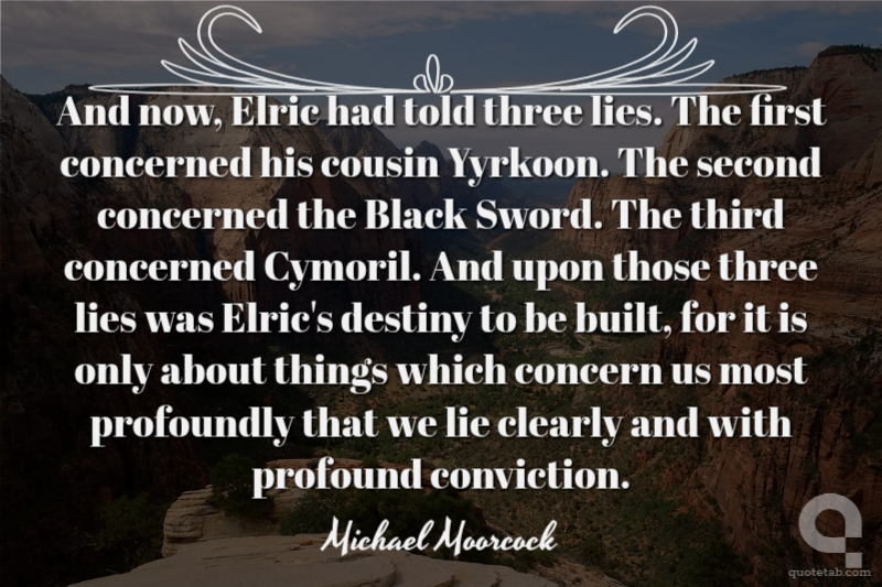 And now, Elric had told three lies. The first concerned his cousin Yyrkoon. The second concerned the Black Sword. The third concerned Cymoril. And upon those three lies was Elric's destiny to be built, for it is only about things which concern us most profoundly that we lie clearly and with profound conviction.