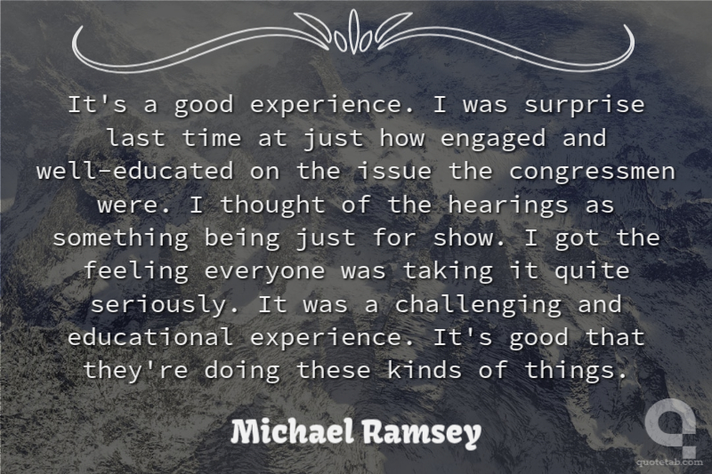 It's a good experience. I was surprise last time at just how engaged and well-educated on the issue the congressmen were. I thought of the hearings as something being just for show. I got the feeling everyone was taking it quite seriously. It was a challenging and educational experience. It's good that they're doing these kinds of things.