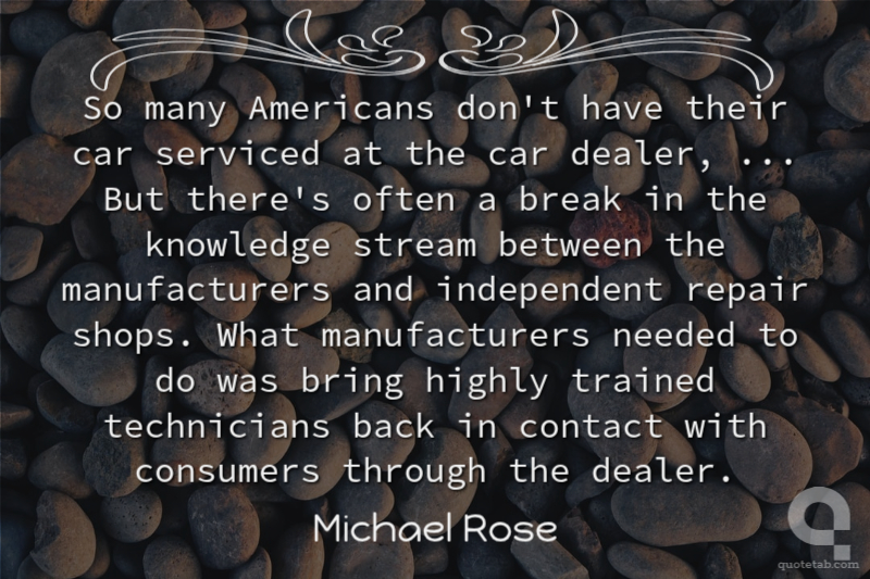 So many Americans don't have their car serviced at the car dealer, ... But there's often a break in the knowledge stream between the manufacturers and independent repair shops. What manufacturers needed to do was bring highly trained technicians back in contact with consumers through the dealer.
