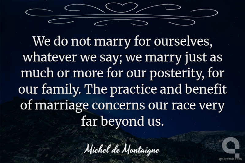 We do not marry for ourselves, whatever we say; we marry just as much or more for our posterity, for our family. The practice and benefit of marriage concerns our race very far beyond us.
