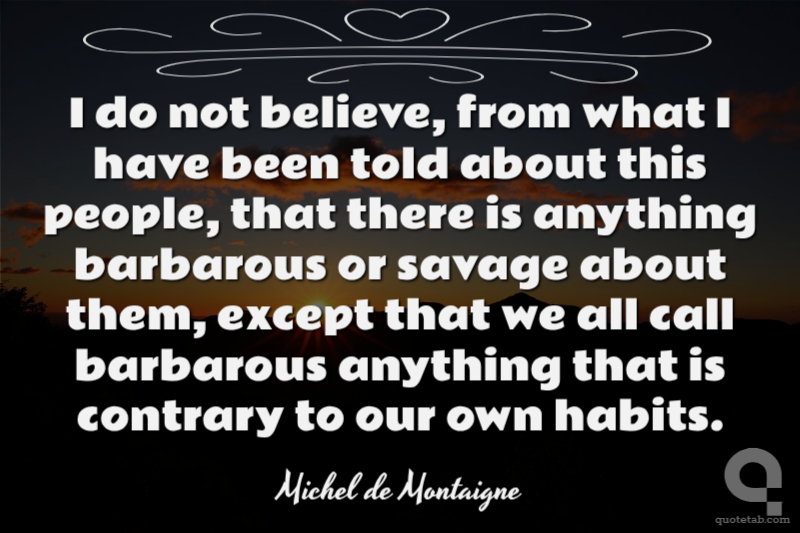 I do not believe, from what I have been told about this people, that there is anything barbarous or savage about them, except that we all call barbarous anything that is contrary to our own habits.