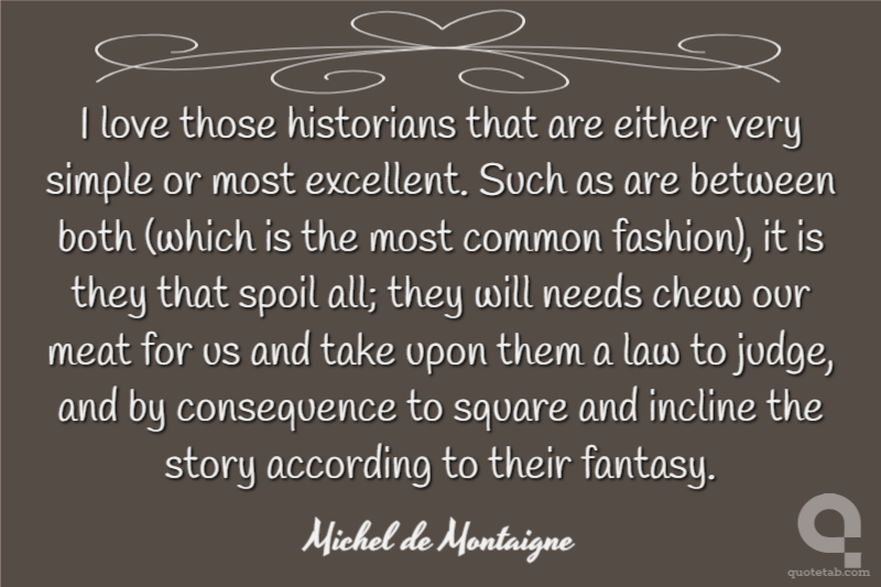 I love those historians that are either very simple or most excellent. Such as are between both (which is the most common fashion), it is they that spoil all; they will needs chew our meat for us and take upon them a law to judge, and by consequence to square and incline the story according to their fantasy.
