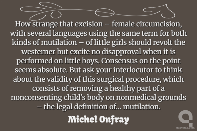 How strange that excision – female circumcision, with several languages using the same term for both kinds of mutilation – of little girls should revolt the westerner but excite no disapproval when it is performed on little boys. Consensus on the point seems absolute. But ask your interlocutor to think about the validity of this surgical procedure, which consists of removing a healthy part of a nonconsenting child’s body on nonmedical grounds – the legal definition of… mutilation.