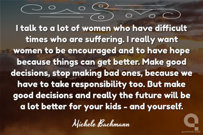 I talk to a lot of women who have difficult times who are suffering. I really want women to be encouraged and to have hope because things can get better. Make good decisions, stop making bad ones, because we have to take responsibility too. But make good decisions and really the future will be a lot better for your kids - and yourself.
