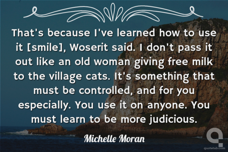 That's because I've learned how to use it [smile], Woserit said. I don't pass it out like an old woman giving free milk to the village cats. It's something that must be controlled, and for you especially. You use it on anyone. You must learn to be more judicious.