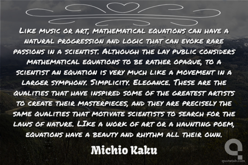 Like music or art, mathematical equations can have a natural progression and logic that can evoke rare passions in a scientist. Although the lay public considers mathematical equations to be rather opaque, to a scientist an equation is very much like a movement in a larger symphony. Simplicity. Elegance. These are the qualities that have inspired some of the greatest artists to create their masterpieces, and they are precisely the same qualities that motivate scientists to search for the laws of nature. LIke a work of art or a haunting poem, equations have a beauty and rhythm all their own.
