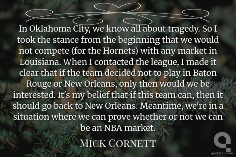 In Oklahoma City, we know all about tragedy. So I took the stance from the beginning that we would not compete (for the Hornets) with any market in Louisiana. When I contacted the league, I made it clear that if the team decided not to play in Baton Rouge or New Orleans, only then would we be interested. It's my belief that if this team can, then it should go back to New Orleans. Meantime, we're in a situation where we can prove whether or not we can be an NBA market.