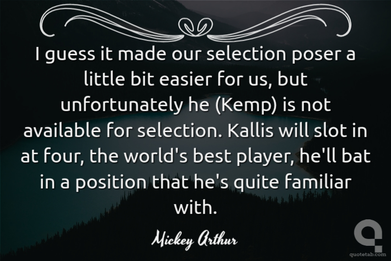I guess it made our selection poser a little bit easier for us, but unfortunately he (Kemp) is not available for selection. Kallis will slot in at four, the world's best player, he'll bat in a position that he's quite familiar with.