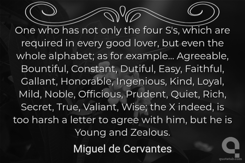 One who has not only the four S's, which are required in every good lover, but even the whole alphabet; as for example... Agreeable, Bountiful, Constant, Dutiful, Easy, Faithful, Gallant, Honorable, Ingenious, Kind, Loyal, Mild, Noble, Officious, Prudent, Quiet, Rich, Secret, True, Valiant, Wise; the X indeed, is too harsh a letter to agree with him, but he is Young and Zealous.