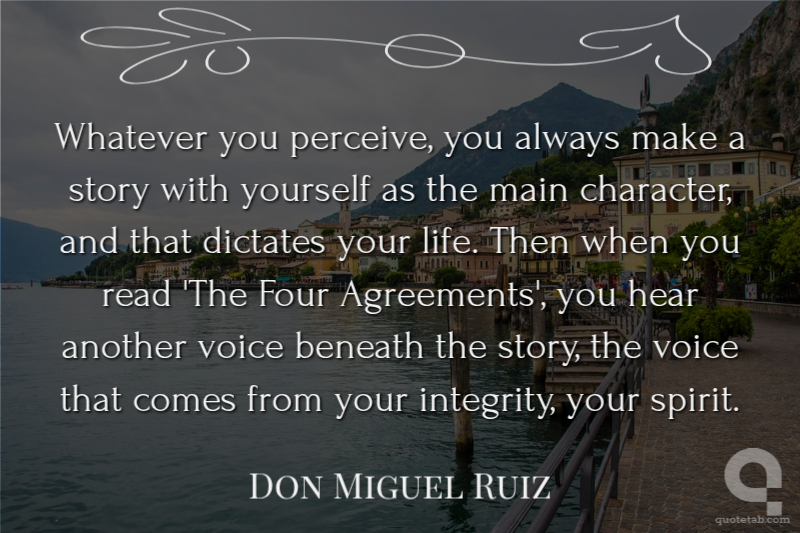 Whatever you perceive, you always make a story with yourself as the main character, and that dictates your life. Then when you read 'The Four Agreements', you hear another voice beneath the story, the voice that comes from your integrity, your spirit.