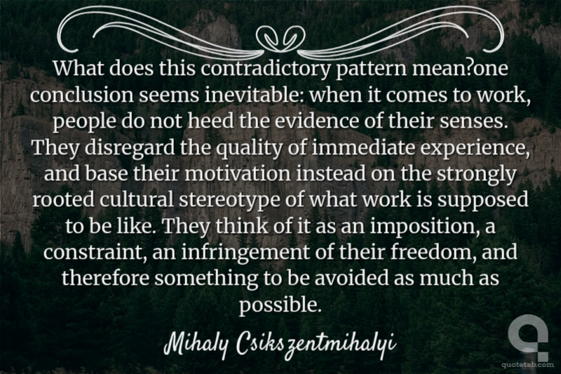What does this contradictory pattern mean?one conclusion seems inevitable: when it comes to work, people do not heed the evidence of their senses. They disregard the quality of immediate experience, and base their motivation instead on the strongly rooted cultural stereotype of what work is supposed to be like. They think of it as an imposition, a constraint, an infringement of their freedom, and therefore something to be avoided as much as possible.