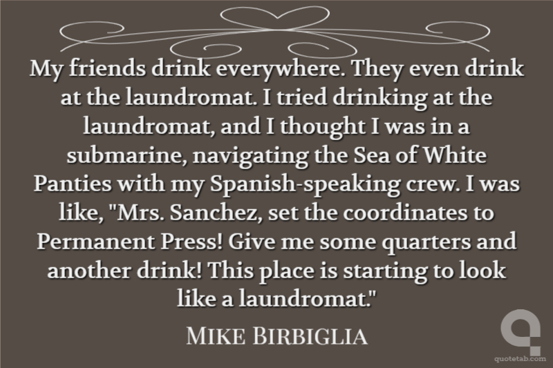 My friends drink everywhere. They even drink at the laundromat. I tried drinking at the laundromat, and I thought I was in a submarine, navigating the Sea of White Panties with my Spanish-speaking crew. I was like, "Mrs. Sanchez, set the coordinates to Permanent Press! Give me some quarters and another drink! This place is starting to look like a laundromat."