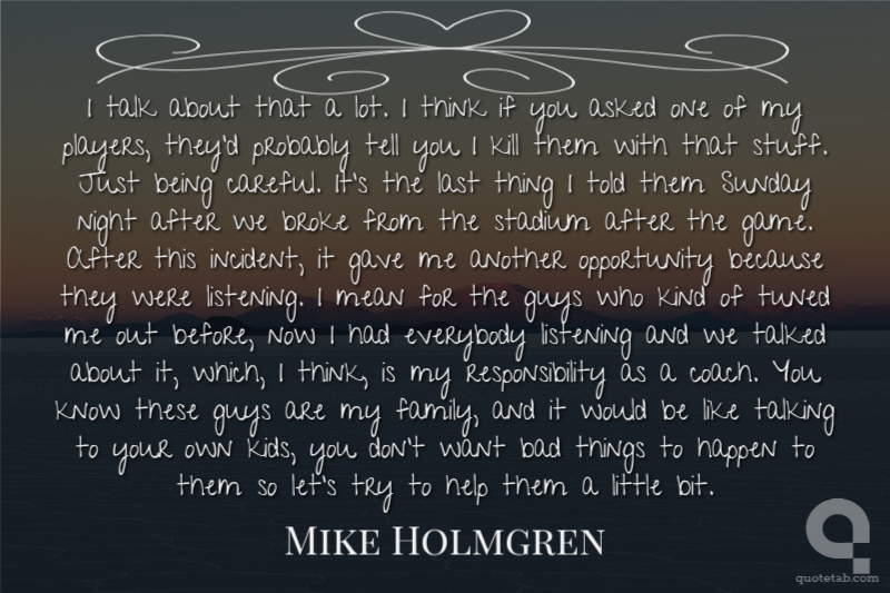 I talk about that a lot. I think if you asked one of my players, they'd probably tell you I kill them with that stuff. Just being careful. It's the last thing I told them Sunday night after we broke from the stadium after the game. After this incident, it gave me another opportunity because they were listening. I mean for the guys who kind of tuned me out before, now I had everybody listening and we talked about it, which, I think, is my responsibility as a coach. You know these guys are my family, and it would be like talking to your own kids, you don't want bad things to happen to them so let's try to help them a little bit.