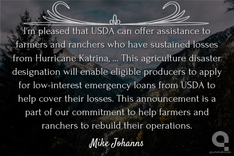 I'm pleased that USDA can offer assistance to farmers and ranchers who have sustained losses from Hurricane Katrina, ... This agriculture disaster designation will enable eligible producers to apply for low-interest emergency loans from USDA to help cover their losses. This announcement is a part of our commitment to help farmers and ranchers to rebuild their operations.