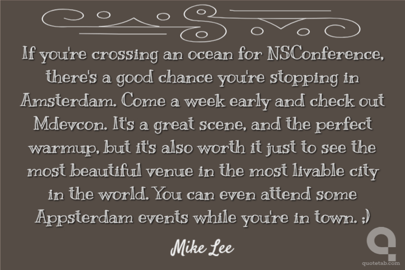 If you're crossing an ocean for NSConference, there's a good chance you're stopping in Amsterdam. Come a week early and check out Mdevcon. It's a great scene, and the perfect warmup, but it's also worth it just to see the most beautiful venue in the most livable city in the world. You can even attend some Appsterdam events while you're in town. ;)