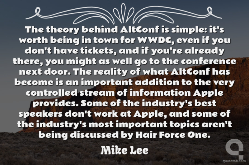 The theory behind AltConf is simple: it's worth being in town for WWDC, even if you don't have tickets, and if you're already there, you might as well go to the conference next door. The reality of what AltConf has become is an important addition to the very controlled stream of information Apple provides. Some of the industry's best speakers don't work at Apple, and some of the industry's most important topics aren't being discussed by Hair Force One.