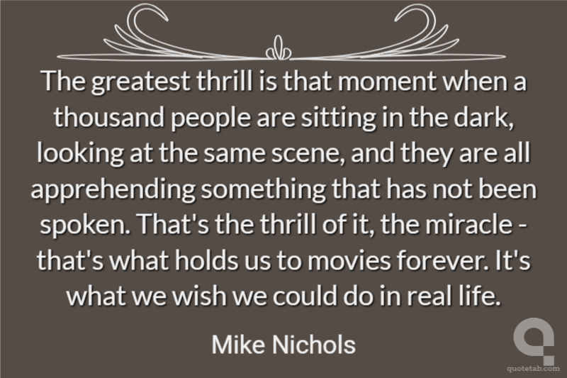 The greatest thrill is that moment when a thousand people are sitting in the dark, looking at the same scene, and they are all apprehending something that has not been spoken. That's the thrill of it, the miracle - that's what holds us to movies forever. It's what we wish we could do in real life.