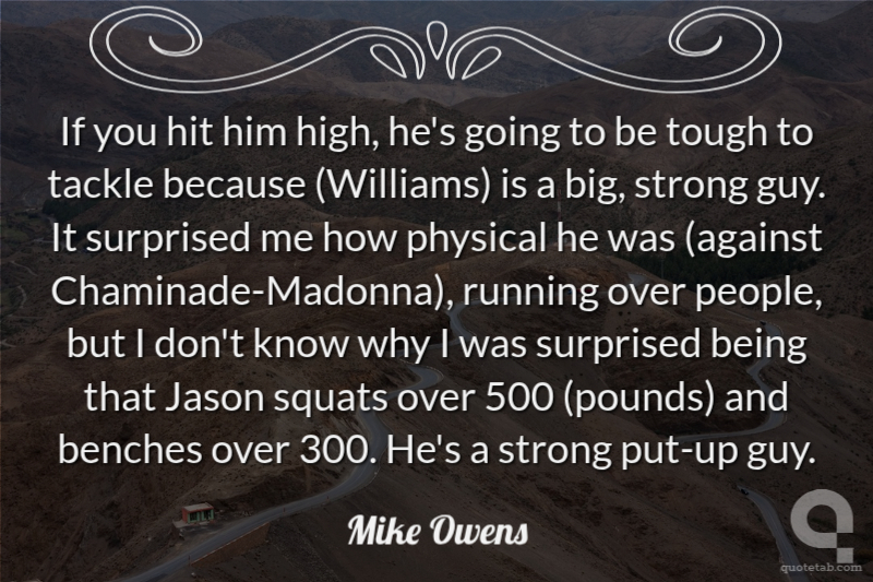 If you hit him high, he's going to be tough to tackle because (Williams) is a big, strong guy. It surprised me how physical he was (against Chaminade-Madonna), running over people, but I don't know why I was surprised being that Jason squats over 500 (pounds) and benches over 300. He's a strong put-up guy.