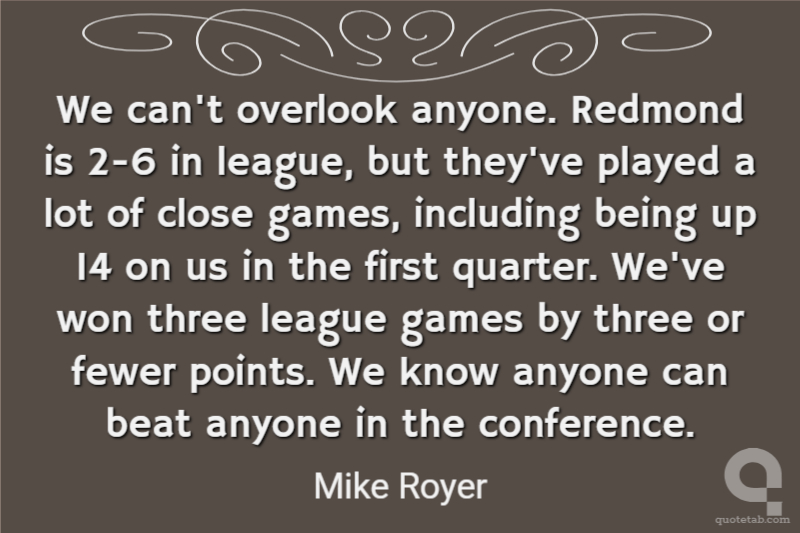 We can't overlook anyone. Redmond is 2-6 in league, but they've played a lot of close games, including being up 14 on us in the first quarter. We've won three league games by three or fewer points. We know anyone can beat anyone in the conference.