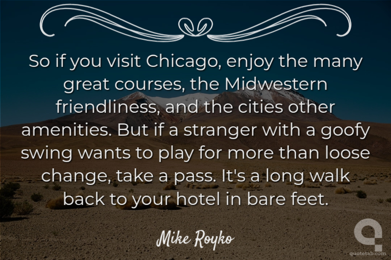 So if you visit Chicago, enjoy the many great courses, the Midwestern friendliness, and the cities other amenities. But if a stranger with a goofy swing wants to play for more than loose change, take a pass. It's a long walk back to your hotel in bare feet.