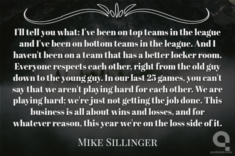 I'll tell you what: I've been on top teams in the league and I've been on bottom teams in the league. And I haven't been on a team that has a better locker room. Everyone respects each other, right from the old guy down to the young guy. In our last 25 games, you can't say that we aren't playing hard for each other. We are playing hard; we're just not getting the job done. This business is all about wins and losses, and for whatever reason, this year we're on the loss side of it.