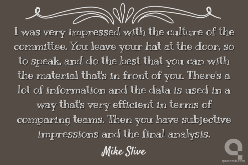 I was very impressed with the culture of the committee. You leave your hat at the door, so to speak, and do the best that you can with the material that's in front of you. There's a lot of information and the data is used in a way that's very efficient in terms of comparing teams. Then you have subjective impressions and the final analysis.