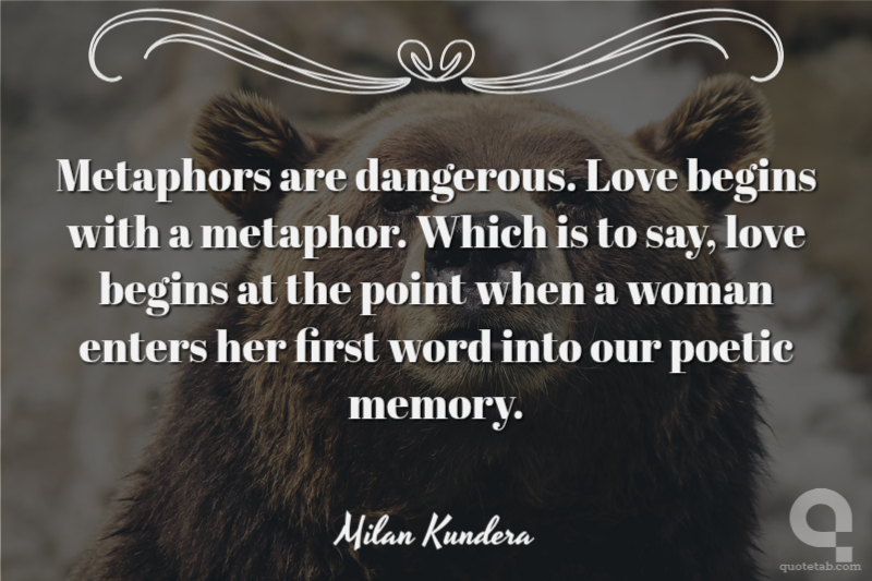 Metaphors are dangerous. Love begins with a metaphor. Which is to say, love begins at the point when a woman enters her first word into our poetic memory.