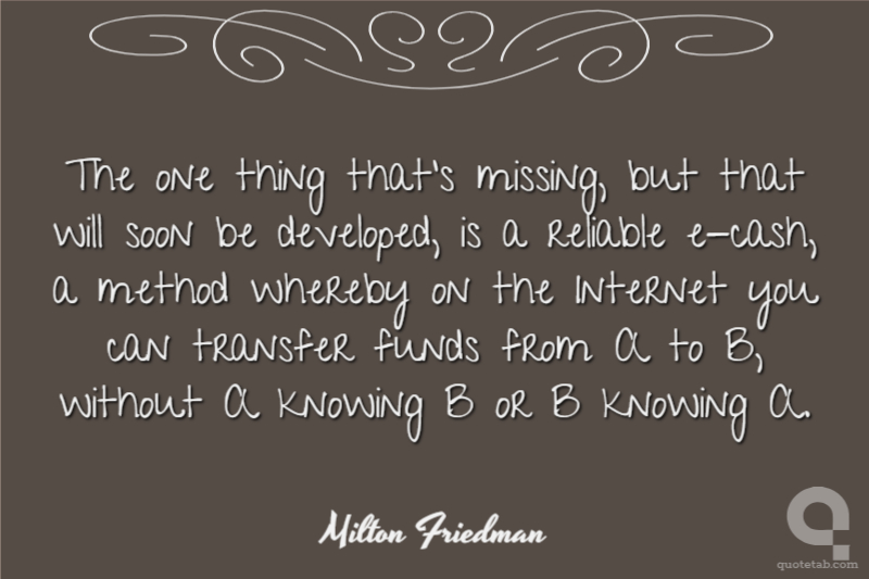 The one thing that’s missing, but that will soon be developed, is a reliable e-cash, a method whereby on the Internet you can transfer funds from A to B, without A knowing B or B knowing A.