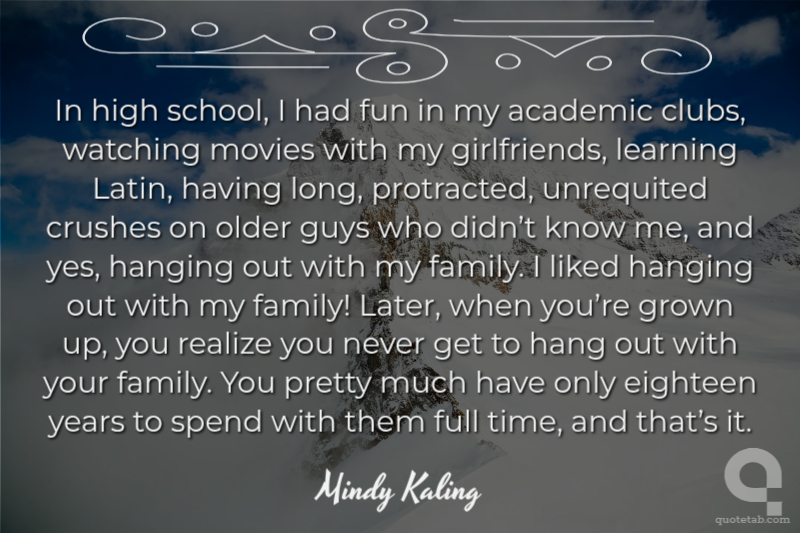 In high school, I had fun in my academic clubs, watching movies with my girlfriends, learning Latin, having long, protracted, unrequited crushes on older guys who didn’t know me, and yes, hanging out with my family. I liked hanging out with my family! Later, when you’re grown up, you realize you never get to hang out with your family. You pretty much have only eighteen years to spend with them full time, and that’s it.