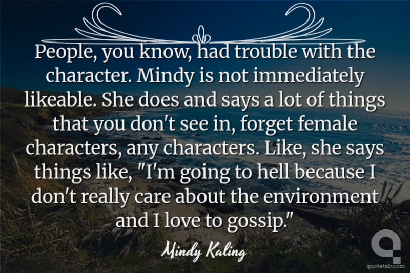 People, you know, had trouble with the character. Mindy is not immediately likeable. She does and says a lot of things that you don't see in, forget female characters, any characters. Like, she says things like, "I'm going to hell because I don't really care about the environment and I love to gossip."