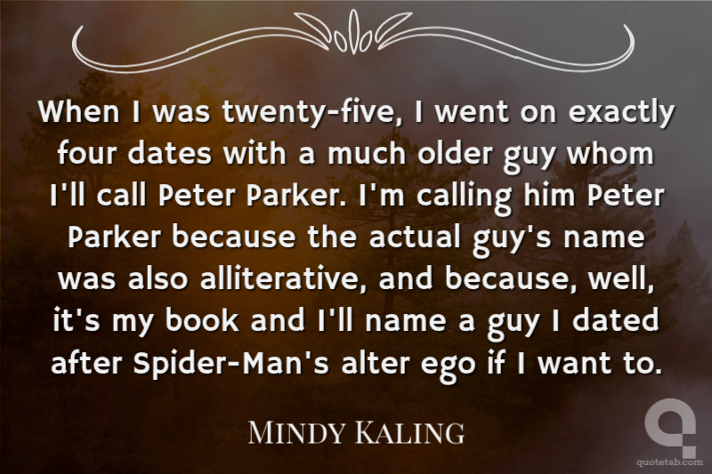 When I was twenty-five, I went on exactly four dates with a much older guy whom I'll call Peter Parker. I'm calling him Peter Parker because the actual guy's name was also alliterative, and because, well, it's my book and I'll name a guy I dated after Spider-Man's alter ego if I want to.