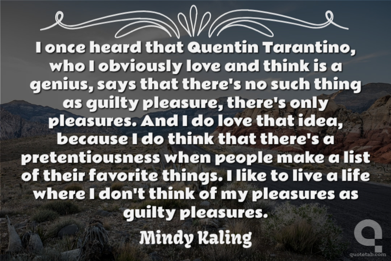 I once heard that Quentin Tarantino, who I obviously love and think is a genius, says that there's no such thing as guilty pleasure, there's only pleasures. And I do love that idea, because I do think that there's a pretentiousness when people make a list of their favorite things. I like to live a life where I don't think of my pleasures as guilty pleasures.