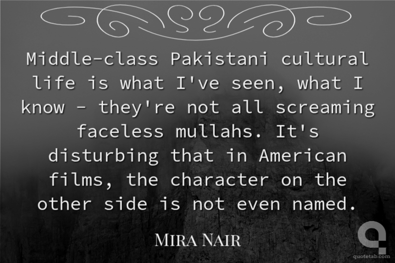 Middle-class Pakistani cultural life is what I've seen, what I know - they're not all screaming faceless mullahs. It's disturbing that in American films, the character on the other side is not even named.