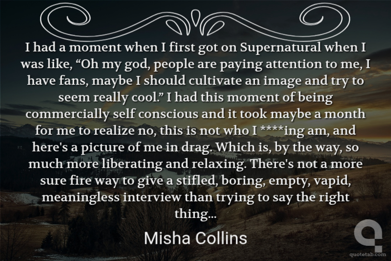 I had a moment when I first got on Supernatural when I was like, “Oh my god, people are paying attention to me, I have fans, maybe I should cultivate an image and try to seem really cool.” I had this moment of being commercially self conscious and it took maybe a month for me to realize no, this is not who I ****ing am, and here's a picture of me in drag. Which is, by the way, so much more liberating and relaxing. There's not a more sure fire way to give a stifled, boring, empty, vapid, meaningless interview than trying to say the right thing...