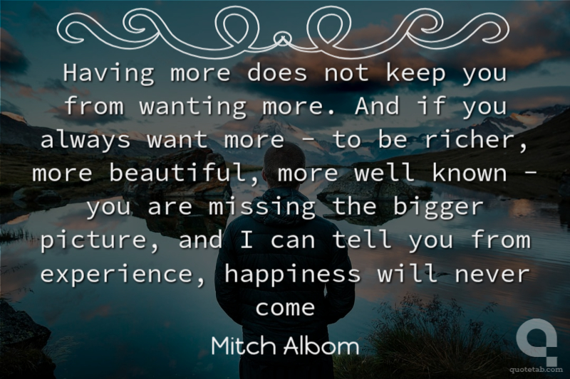 Having more does not keep you from wanting more. And if you always want more - to be richer, more beautiful, more well known - you are missing the bigger picture, and I can tell you from experience, happiness will never come