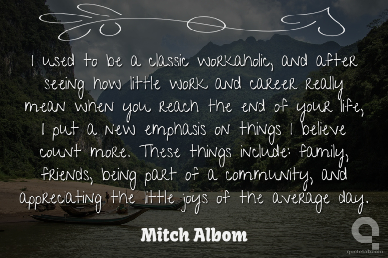 I used to be a classic workaholic, and after seeing how little work and career really mean when you reach the end of your life, I put a new emphasis on things I believe count more. These things include: family, friends, being part of a community, and appreciating the little joys of the average day.