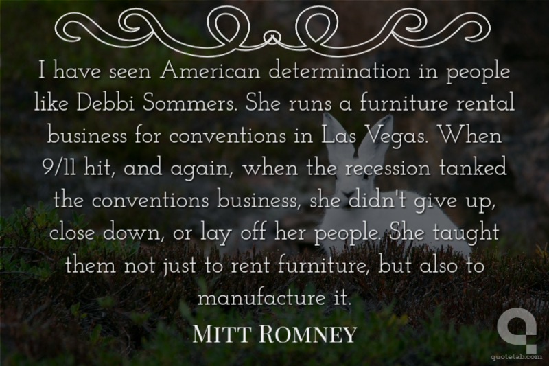 I have seen American determination in people like Debbi Sommers. She runs a furniture rental business for conventions in Las Vegas. When 9/11 hit, and again, when the recession tanked the conventions business, she didn't give up, close down, or lay off her people. She taught them not just to rent furniture, but also to manufacture it.