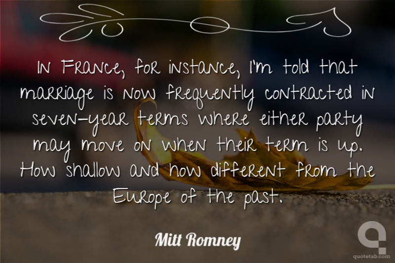 In France, for instance, I'm told that marriage is now frequently contracted in seven-year terms where either party may move on when their term is up. How shallow and how different from the Europe of the past.