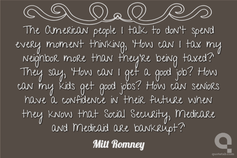 The American people I talk to don't spend every moment thinking, 'How can I tax my neighbor more than they're being taxed?' They say, 'How can I get a good job? How can my kids get good jobs? How can seniors have a confidence in their future when they know that Social Security, Medicare and Medicaid are bankrupt?'