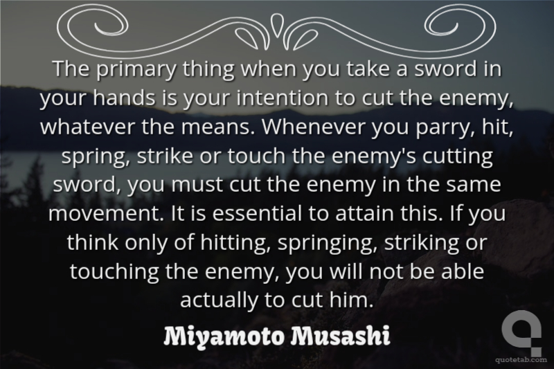 The primary thing when you take a sword in your hands is your intention to cut the enemy, whatever the means. Whenever you parry, hit, spring, strike or touch the enemy's cutting sword, you must cut the enemy in the same movement. It is essential to attain this. If you think only of hitting, springing, striking or touching the enemy, you will not be able actually to cut him.