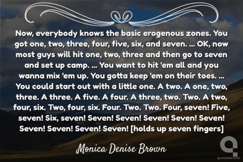 Now, everybody knows the basic erogenous zones. You got one, two, three, four, five, six, and seven. ... OK, now most guys will hit one, two, three and then go to seven and set up camp. ... You want to hit 'em all and you wanna mix 'em up. You gotta keep 'em on their toes. ... You could start out with a little one. A two. A one, two, three. A three. A five. A four. A three, two. Two. A two, four, six. Two, four, six. Four. Two. Two. Four, seven! Five, seven! Six, seven! Seven! Seven! Seven! Seven! Seven! Seven! Seven! Seven! Seven! [holds up seven fingers]