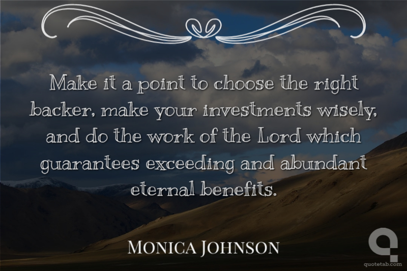 Make it a point to choose the right backer, make your investments wisely, and do the work of the Lord which guarantees exceeding and abundant eternal benefits.