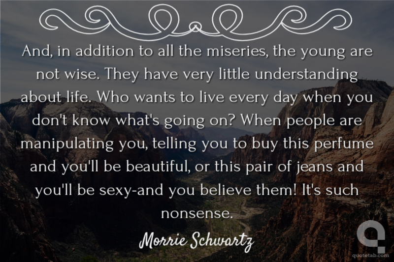 And, in addition to all the miseries, the young are not wise. They have very little understanding about life. Who wants to live every day when you don't know what's going on? When people are manipulating you, telling you to buy this perfume and you'll be beautiful, or this pair of jeans and you'll be sexy-and you believe them! It's such nonsense.